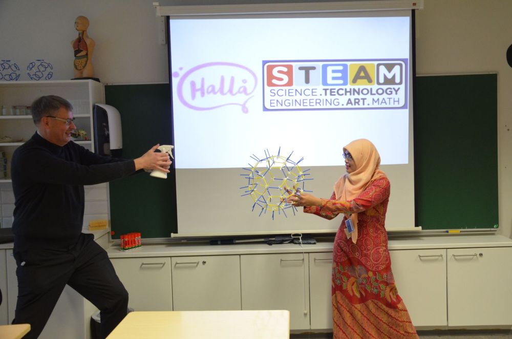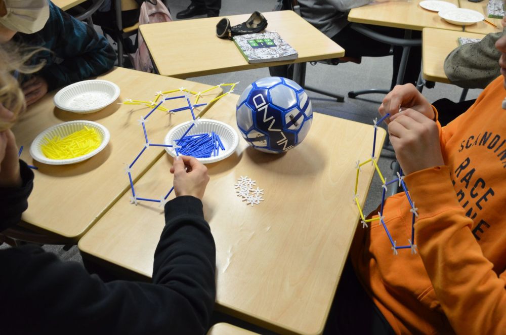 November 4 was the annual theme day of “Awesome Mathematics” – the Finnish day of Maths. On November 4, the Hallå STEAM! team visited the Christian School in Jyväskylä to meet ninth graders who already knew Swedish quite well. In the class, the possible patterns of the ball surface were introduced, using the so-called “classic” pattern of football as an example, which, however, did not become common until the 1970s. The students were given the task to build a model of “classical football” (i.e. truncated icosahedron) in either the blue-white colors of Finland or the blue-yellow colors of Sweden (Sweden won the race).
