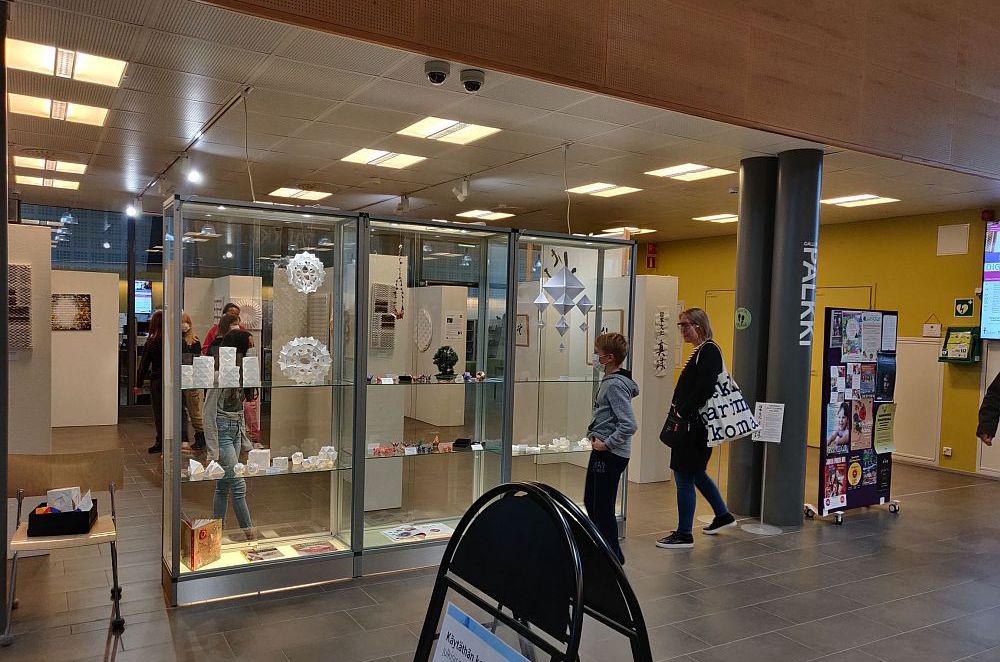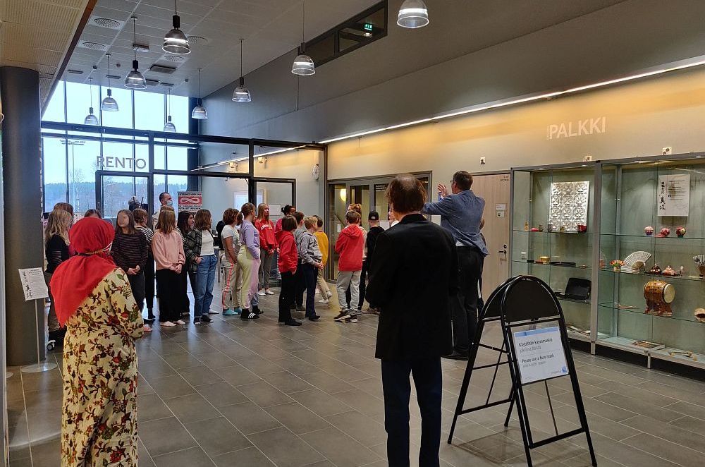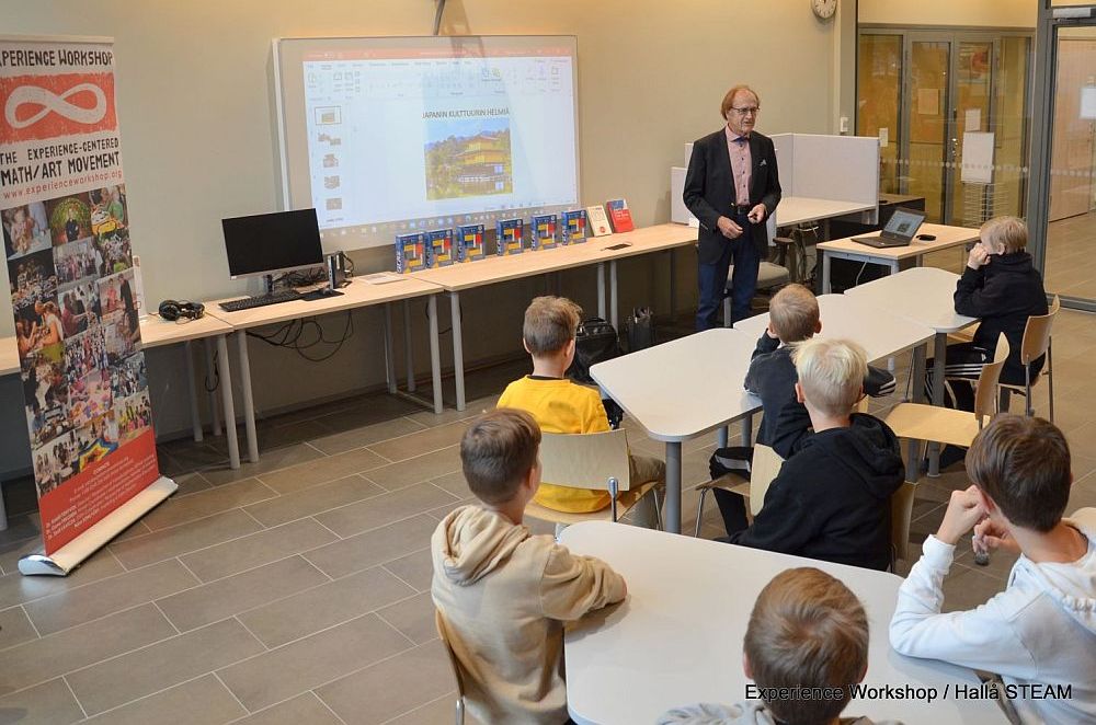 Origami artist Kaija Toivakka and the chairman of the Jyväskylä Finnish-Japanese Association, also known as a visual artist, Juhani Lillberg also took part in the event. Under their guidance, students got acquainted with the exhibition of Japanese art.