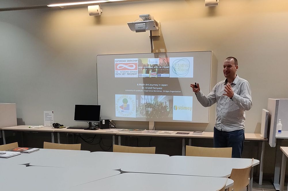 After a long break caused by the Covid19 pandemic, we were able to relaunch the Hallå STEAM school visits. On October 28, 2021, a very special event was held at the Palokka school in Jyväskylä, the theme of which was Japanese culture. First of all, the Palokka Cultural Center exhibited Japanese mathematical art organized by the Finnish-Japanese Association of Jyväskylä, which included origami and handicrafts representing the regular geometric decorative pattern of a spherical body (Japanese: Temari). Mathematically, Temari is connected with the theory of regular complexes and topology. These connections were highlighted by Kristóf Fenyvesi.