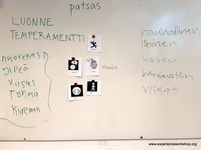 6. Luonne/temperamentti: osallistujat jaetaan pienempiin ryhmiin, joissa keksitään eri luonteenpiirteitä/kuvaavia sanoja ihmisistä, esim. kaunis, rehellinen, iloinen, pelottava, rakastunut… Kaikki keksityt sanat kirjoitetaan ylös paperille. Huom! Kaikkien ryhmässä on ymmärrettävä nämä sanat. Jos joku ei ymmärrä, ryhmä selittää.