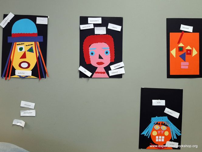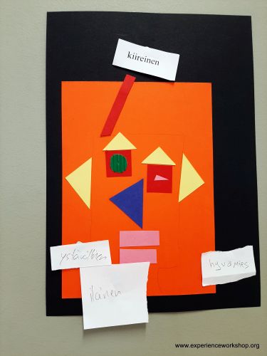 - Muista väripapereista leikataan geometrisia muotoja, joista tulee kasvojen osia.