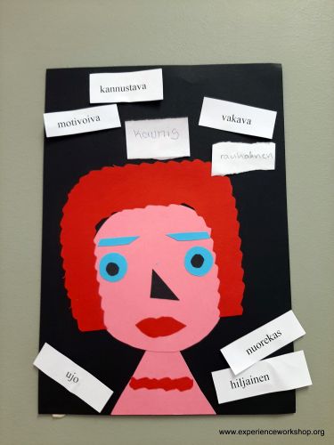 - Suunnitellaan omakuva ja liimataan kasvon osat omalle paperille. Tämän kohdan voi toteuttaa myös pareittain tai pienissä ryhmissä, jolloin paperille ei tehdäkään omia kuvia vaan esimerkiksi mielikuvitushenkilö, joka toteutetaan tekijöiden toiveiden mukaan. Tälle mielikuvitushenkilölle voidaan antaa nimi sekä muita kuvaavia ominaisuuksia, kuten ikä, sukupuoli ja ammatti.