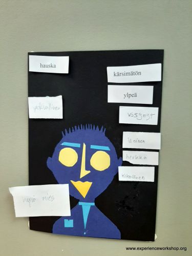11. Kerrataan luonnesanoja pienissä ryhmissä tai pareittain niin, että jokainen ymmärtää sanat. Tämän jälkeen käydään kiinnittämässä seinillä olevien Picasso-kasvojen viereen näitä luonnesanoja. Kirjoitetaan uusia sanoja, jotka tulevat esiin keskusteluissa, ja lisätään nekin kasvojen viereen.