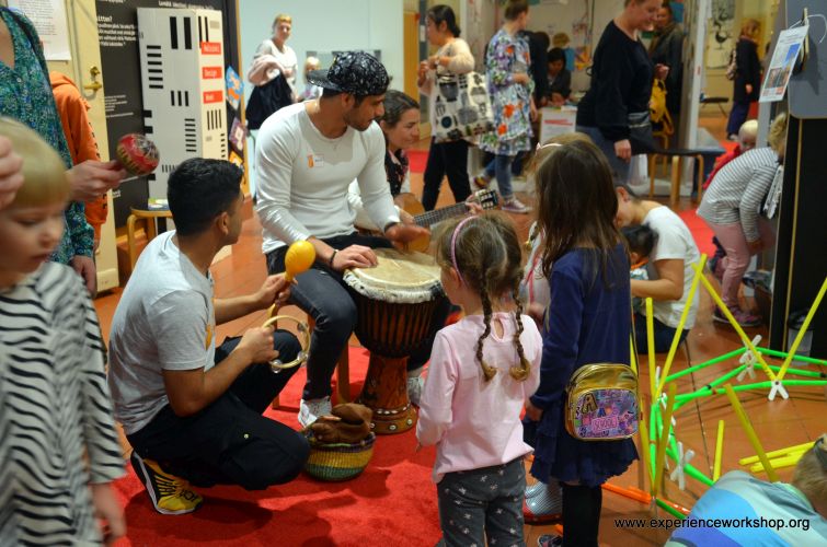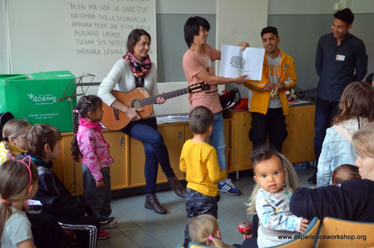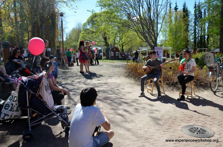 Tapahtumaan valitsimme lauluiksi tuttuja suomalaisia lastenlauluja, kuten Elefanttimarssi, joihin mahdollisimman moni voisi tulla mukaan matalalla kynnyksellä. Ennen tapahtumaa kävimme laulut läpi Oma polku -ryhmässä, ja kaksi vapaaehtoista tuli mukaan toteuttamaan musiikkiosuutta. Pisteemme sijaitsi hyvin keskeisellä paikalla puistossa, joten päivään mahtui monia musiikillisia kohtaamisia. Kaikki pääsivät osallistumaan ja halutessaan myös kokeilemaan soittimia ja toivomaan lauluja, joita toteutimme mahdollisuuksien mukaan. Viereisestä afrikkalaisen ruoan pisteestä saimme joukkoomme mukaan erään miehen djembeä soittamaan, ja yksi nuori vapaaehtoinen lauloi ja soitti afganistanilaista perinnesoitinta damburaa.